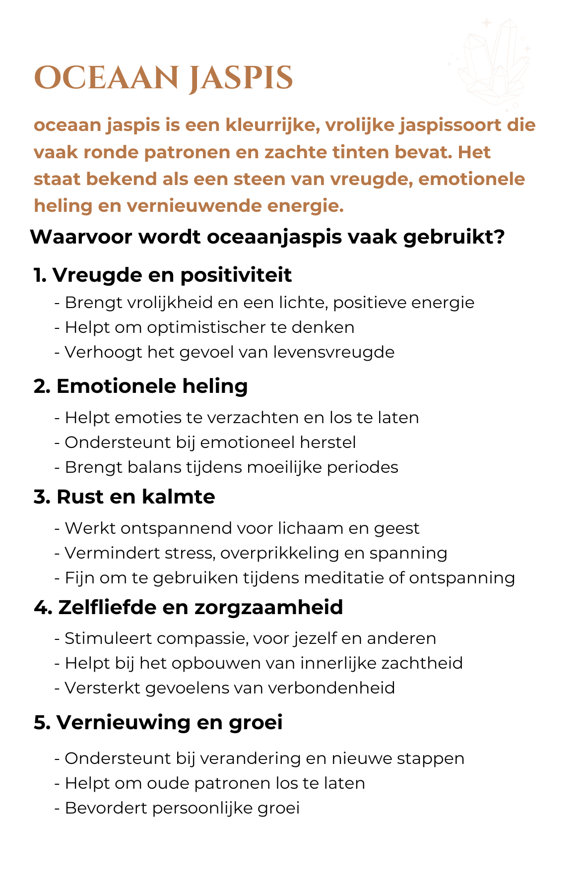 Oceaan jaspis is een kleurrijke, vrolijke jaspissoort die vaak ronde patronen en zachte tinten bevat. Het staat bekend als een steen van vreugde, emotionele heling en vernieuwende energie.