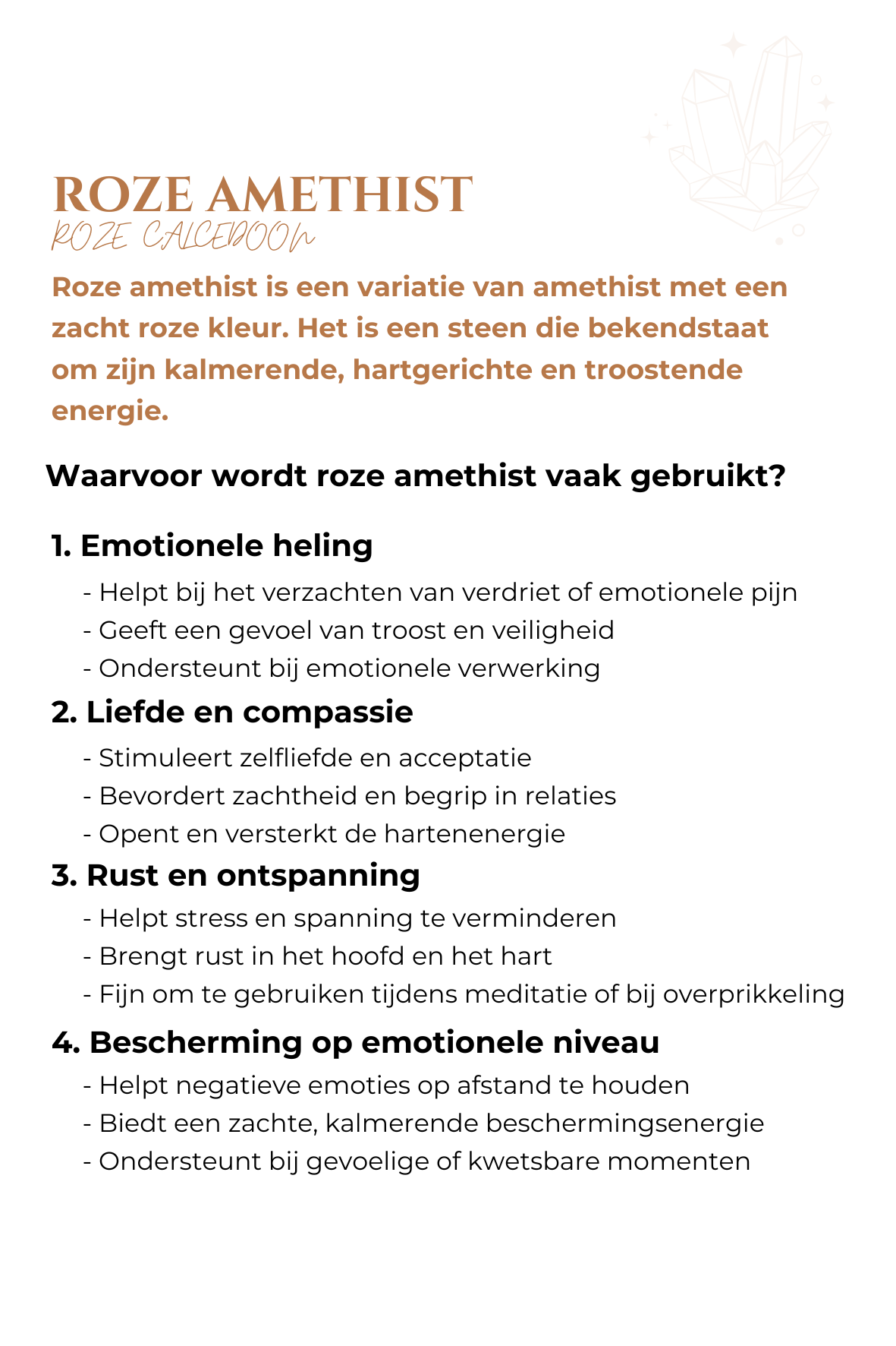 Roze amethist (wat de verkoop naam is voor roze Chalcedoon) is een variatie van amethist met een zacht roze kleur. Het is een steen die bekendstaat om zijn kalmerende, hartgerichte en troostende energie.